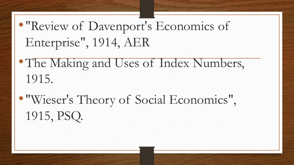 "Review of Davenport's Economics of Enterprise", 1914, AER The Making and Uses of Index Numbers, 1915. " Wieser's Theory of Social Economics", 1915, PSQ.