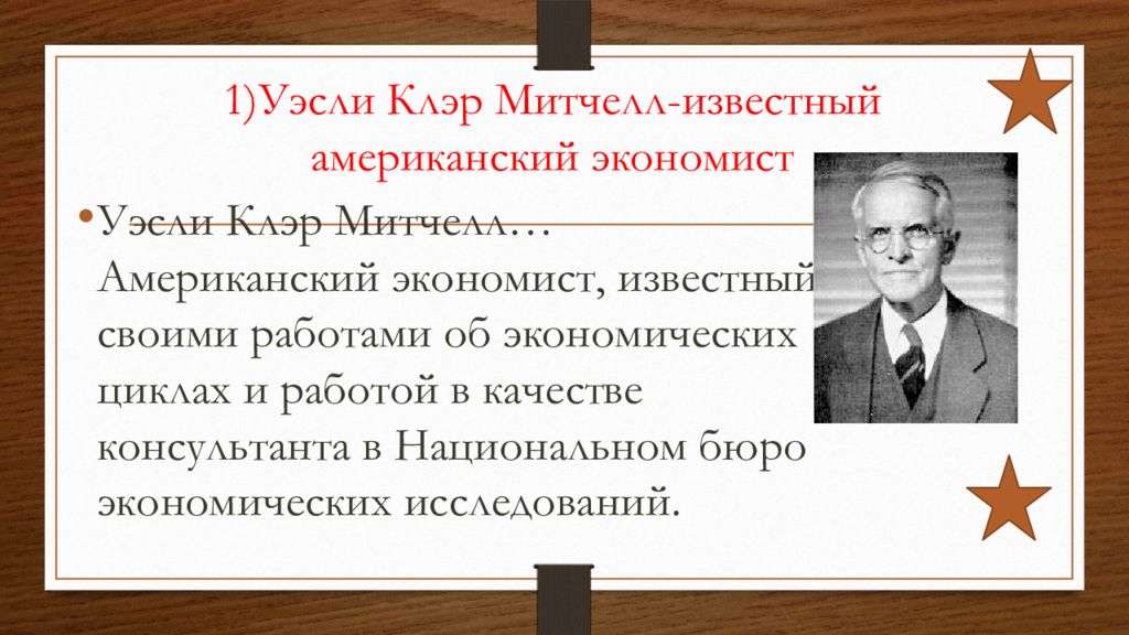 Уэсли Клэр Митчелл…Американский экономист, известный своими работами об экономических циклах и работой в качестве консультанта в Национальном бюро экономических исследований.