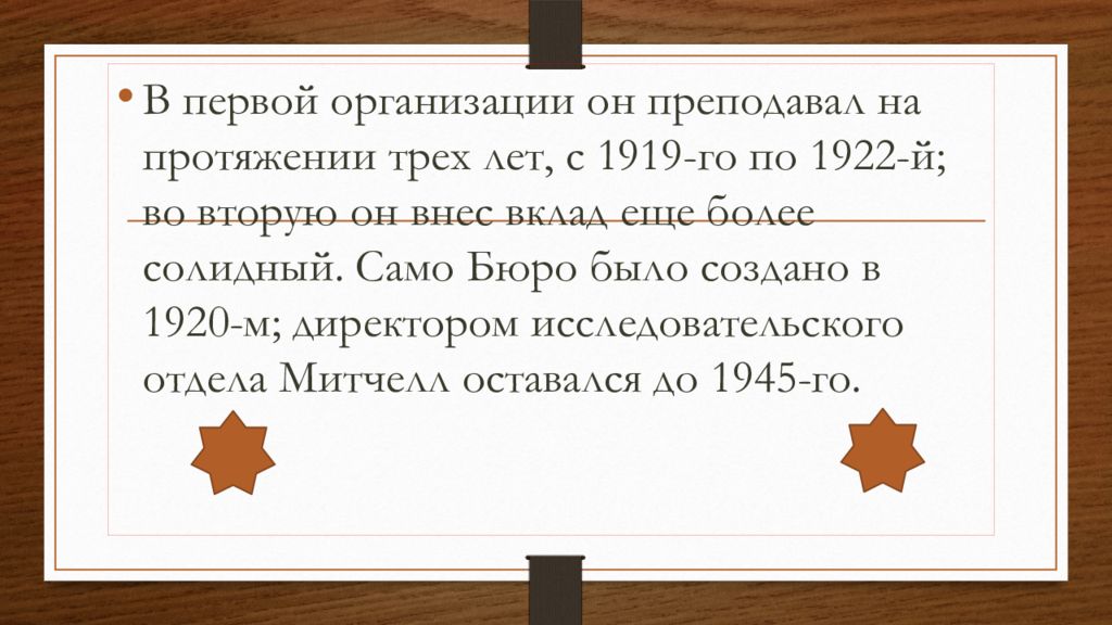 В первой организации он преподавал на протяжении трех лет, с 1919-го по 1922-й; во вторую он внес вклад еще более солидный. Само Бюро было создано в 1920-м; директором исследовательского отдела Митчелл оставался до 1945-го.