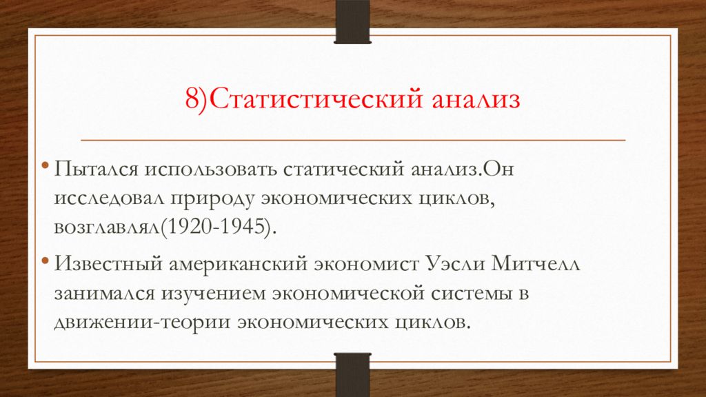 Пытался использовать статический анализ.Он исследовал природу экономических циклов, возглавлял(1920-1945). Известный американский экономист Уэсли Митчелл занимался изучением экономической системы в движении-теории экономических циклов.