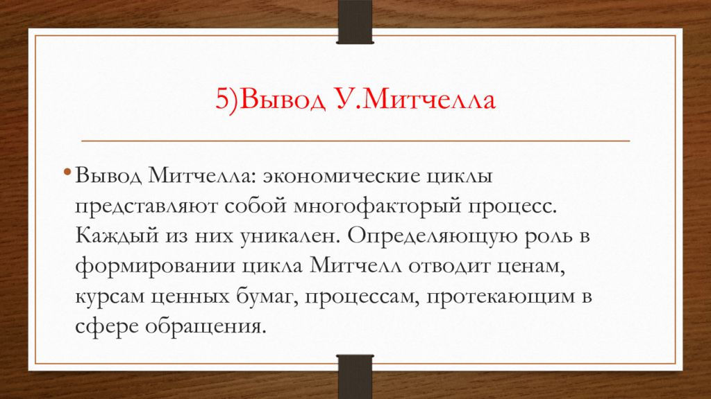 Вывод Митчелла: экономические циклы представляют собой многофакторый процесс. Каждый из них уникален. Определяющую роль в формировании цикла Митчелл отводит ценам, курсам ценных бумаг, процессам, протекающим в сфере обращения.