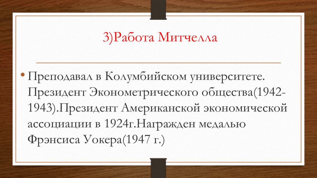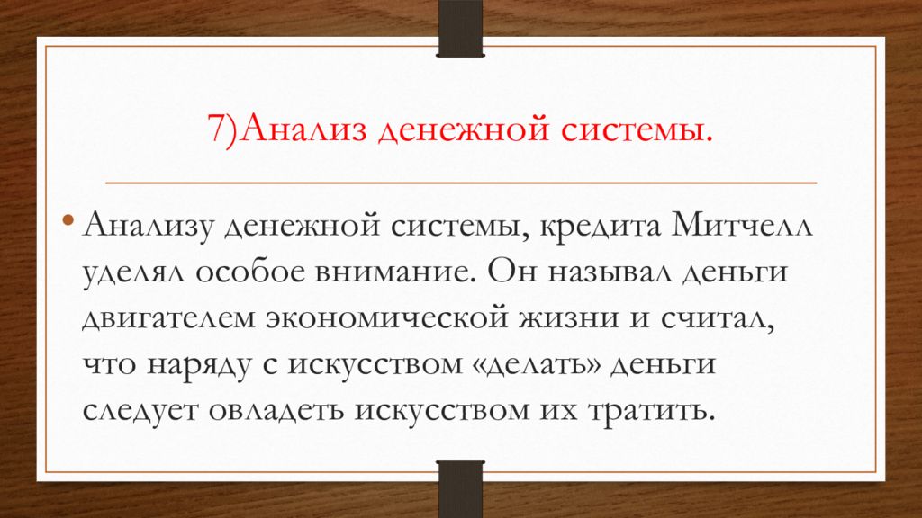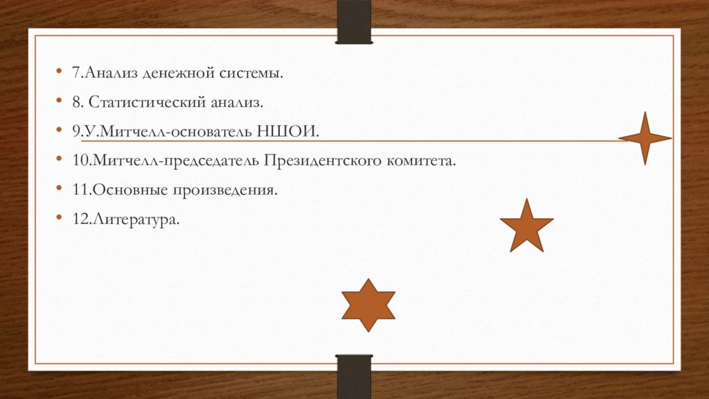 7.Анализ денежной системы. 8. Статистический анализ. 9.У.Митчелл-основатель НШОИ. 10.Митчелл-председатель Президентского комитета. 11.Основные произведения. 12.Литература.