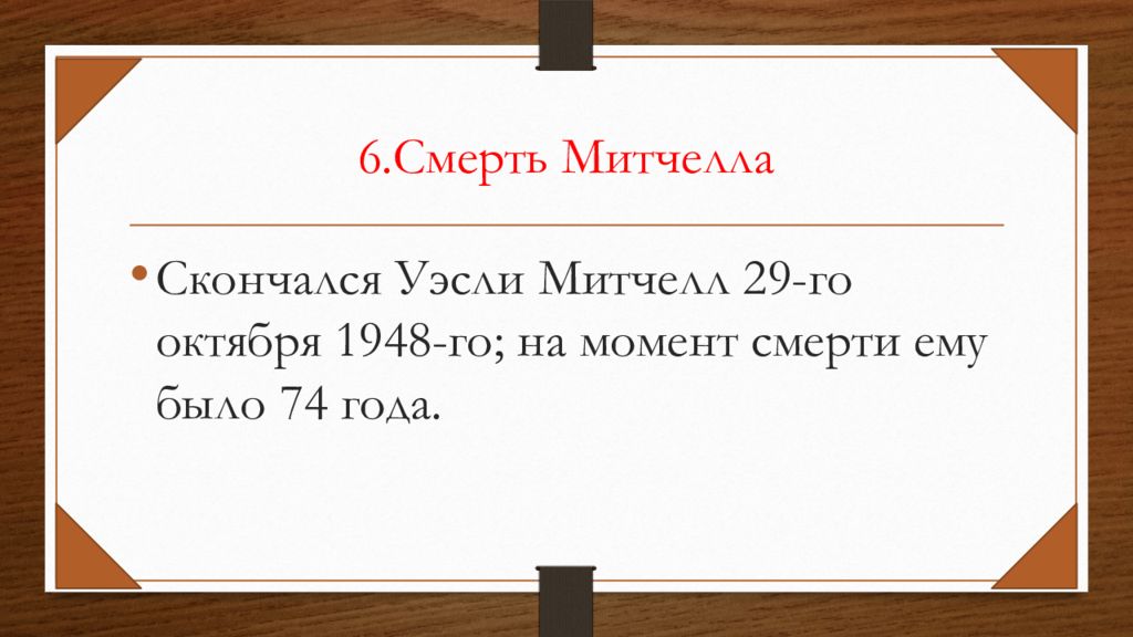 Скончался Уэсли Митчелл 29-го октября 1948-го; на момент смерти ему было 74 года.