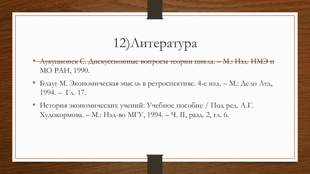 Аукуционек С. Дискуссионные вопросы теории цикла. – М.: Изд. ИМЭ и МО РАН, 1990. Блауг М. Экономическая мысль в ретроспективе. 4-е изд. – М.: Дело Лтд, 1994. – Гл. 17. История экономических учений: Учебное пособие / Под ред. А.Г. Худокормова. – М.: Изд-во МГУ, 1994. – Ч. II, разд. 2, гл. 6.