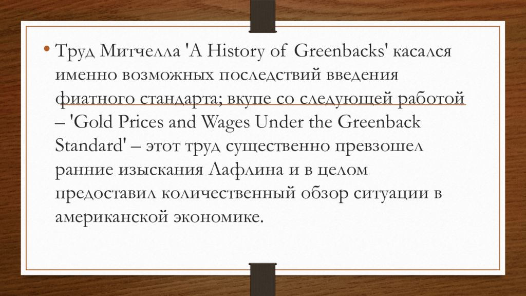 Труд Митчелла 'A History of Greenbacks ' касался именно возможных последствий введения фиатного стандарта; вкупе со следующей работой – ' Gold Prices and Wages Under the Greenback Standard ' – этот труд существенно превзошел ранние изыскания Лафлина и в целом предоставил количественный обзор ситуации в американской экономике.