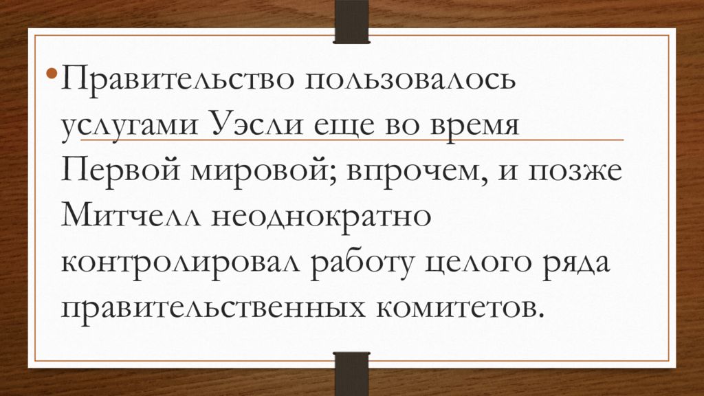 Правительство пользовалось услугами Уэсли еще во время Первой мировой; впрочем, и позже Митчелл неоднократно контролировал работу целого ряда правительственных комитетов.