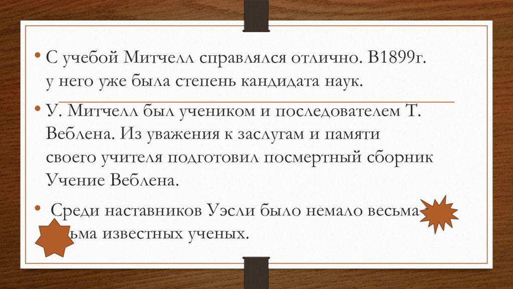 С учебой Митчелл справлялся отлично. В1899г. у него уже была степень кандидата наук. У. Митчелл был учеником и последователем Т. Веблена. Из уважения к заслугам и памяти своего учителя подготовил посмертный сборник Учение Веблена. Среди наставников Уэсли было немало весьма и весьма известных ученых.