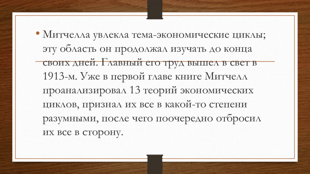 Митчелла увлекла тема-экономические циклы; эту область он продолжал изучать до конца своих дней. Главный его труд вышел в свет в 1913-м. Уже в первой главе книге Митчелл проанализировал 13 теорий экономических циклов, признал их все в какой-то степени разумными, после чего поочередно отбросил их все в сторону.