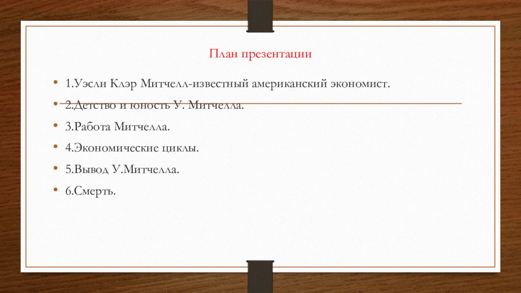 1.Уэсли Клэр Митчелл-известный американский экономист. 2.Детство и юность У. Митчелла. 3.Работа Митчелла. 4.Экономические циклы. 5.Вывод У.Митчелла. 6.Смерть.