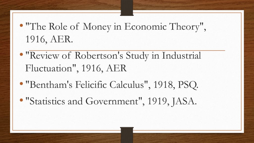 "The Role of Money in Economic Theory", 1916, AER. "Review of Robertson's Study in Industrial Fluctuation", 1916, AER "Bentham's Felicific Calculus", 1918, PSQ. "Statistics and Government", 1919, JASA.