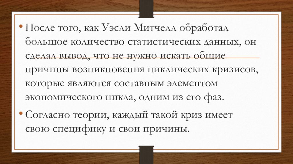 После того, как Уэсли Митчелл обработал большое количество статистических данных, он сделал вывод, что не нужно искать общие причины возникновения циклических кризисов, которые являются составным элементом экономического цикла, одним из его фаз. Согласно теории, каждый такой криз имеет свою специфику и свои причины.