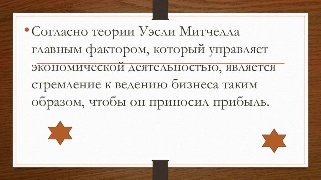Согласно теории Уэсли Митчелла главным фактором, который управляет экономической деятельностью, является стремление к ведению бизнеса таким образом, чтобы он приносил прибыль.