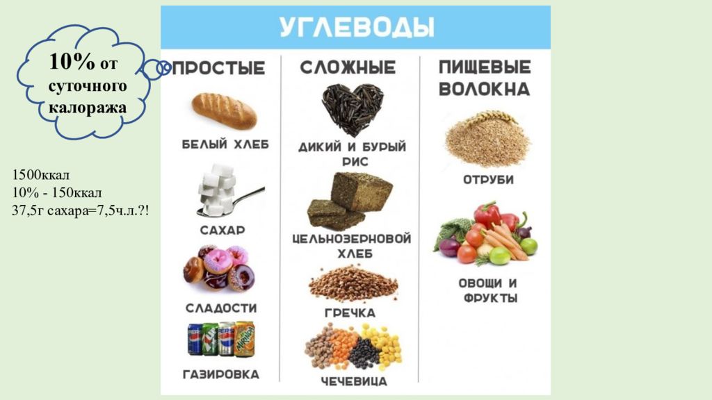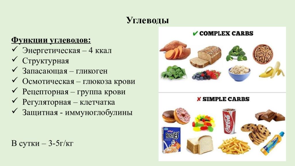Углеводы Функции углеводов: Энергетическая – 4 ккал Структурная Запасающая – гликоген Осмотическая – глюкоза крови Рецепторная – группа крови Регуляторная – клетчатка Защитная - иммуноглобулины В сутки – 3-5г/кг