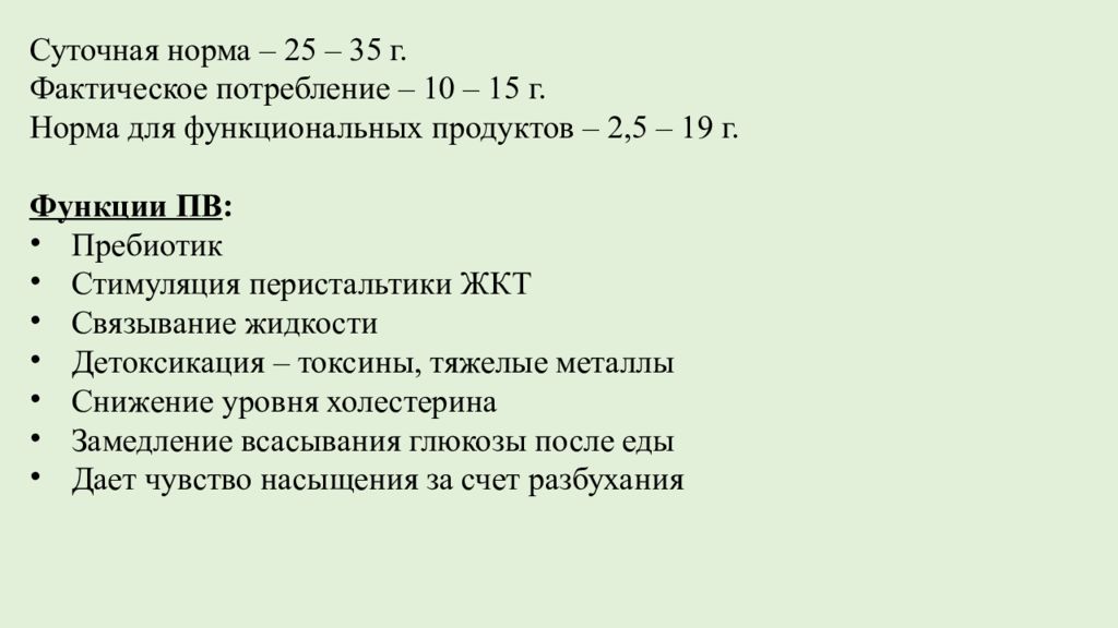 Суточная норма – 25 – 35 г. Фактическое потребление – 10 – 15 г. Норма для функциональных продуктов – 2,5 – 19 г. Функции ПВ : Пребиотик Стимуляция перистальтики ЖКТ Связывание жидкости Детоксикация – токсины, тяжелые металлы Снижение уровня холестерина Замедление всасывания глюкозы после еды Дает чувство насыщения за счет разбухания