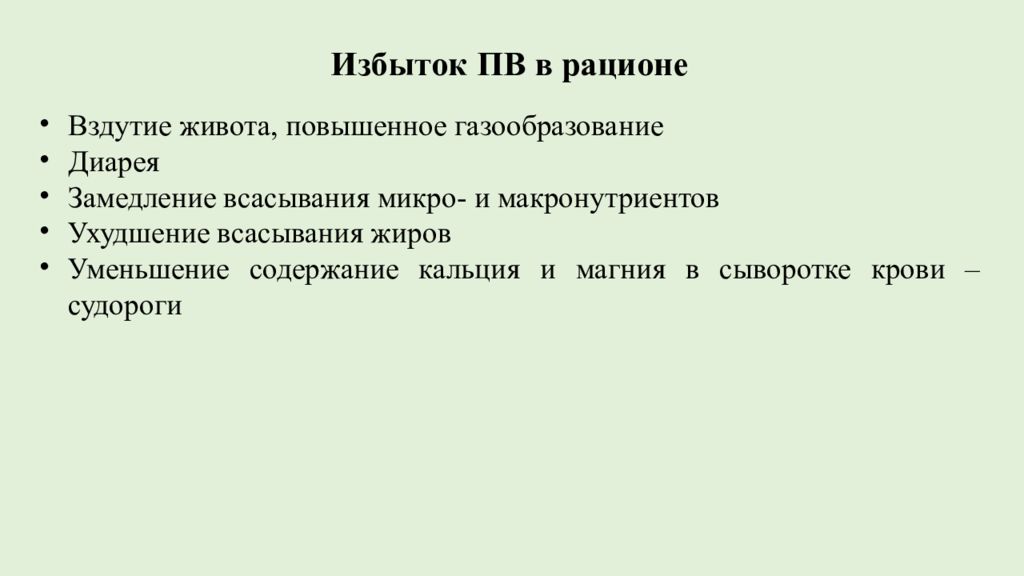 Избыток ПВ в рационе Вздутие живота, повышенное газообразование Диарея Замедление всасывания микро- и макронутриентов Ухудшение всасывания жиров Уменьшение содержание кальция и магния в сыворотке крови – судороги