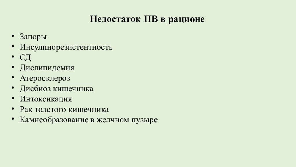 Недостаток ПВ в рационе Запоры Инсулинорезистентность СД Дислипидемия Атеросклероз Дисбиоз кишечника Интоксикация Рак толстого кишечника Камнеобразование в желчном пузыре