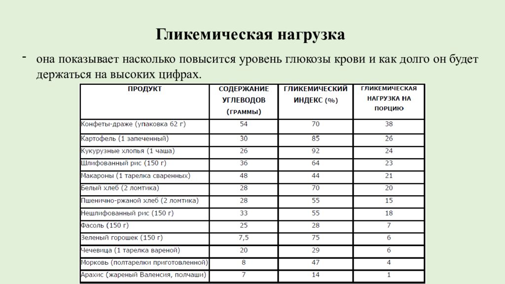 Гликемическая нагрузка она показывает насколько повысится уровень глюкозы крови и как долго он будет держаться на высоких цифрах.
