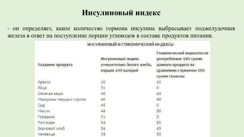 Инсулиновый индекс - он определяет, какое количество гормона инсулина выбрасывает поджелудочная железа в ответ на поступление порции углеводов в составе продуктов питания.