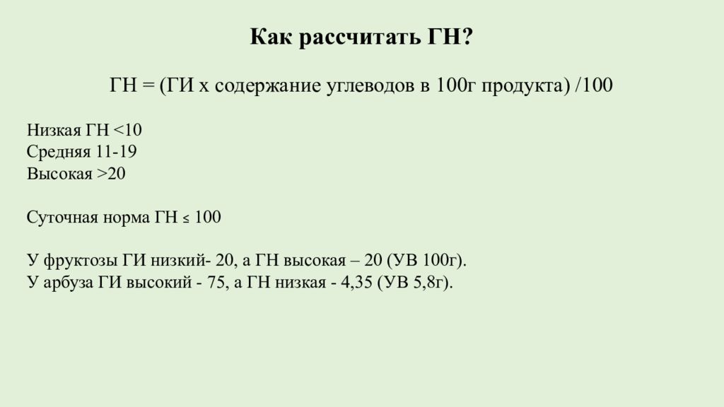 Как рассчитать ГН? ГН = (ГИ х содержание углеводов в 100г продукта) /100 Низкая ГН <10 Средняя 11-19 Высокая >20 Суточная норма ГН ≤ 100 У фруктозы ГИ низкий- 20, а ГН высокая – 20 (УВ 100г). У арбуза ГИ высокий - 75, а ГН низкая - 4,35 (УВ 5,8г).