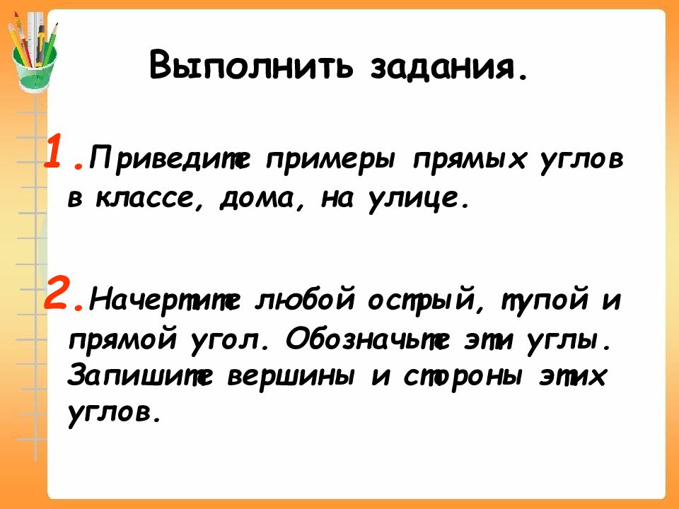 1. Приведите примеры прямых углов в классе, дома, на улице. 2. Начертите любой острый, тупой и прямой угол. Обозначьте эти углы. Запишите вершины и стороны этих углов.