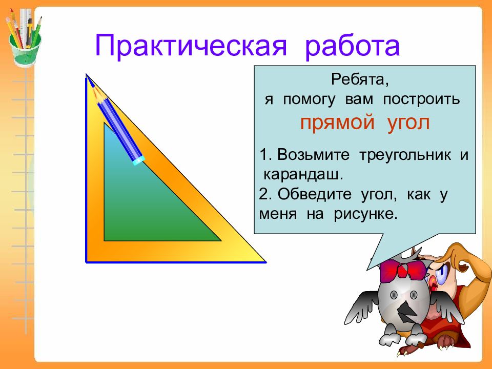 Начертите разные углы Ребята, я помогу вам построить прямой угол 1. Возьмите треугольник и карандаш. 2. Обведите угол, как у меня на рисунке.