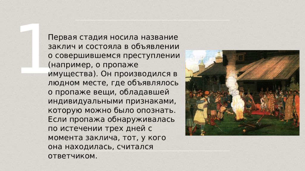 1 Первая стадия носила название заклич и состояла в объявлении о совершившемся преступлении (например, о пропаже имущества). Он производился в людном месте, где объявлялось о пропаже вещи, обладавшей индивидуальными признаками, которую можно было опознать. Если пропажа обнаруживалась по истечении трех дней с момента заклича, тот, у кого она находилась, считался ответчиком.