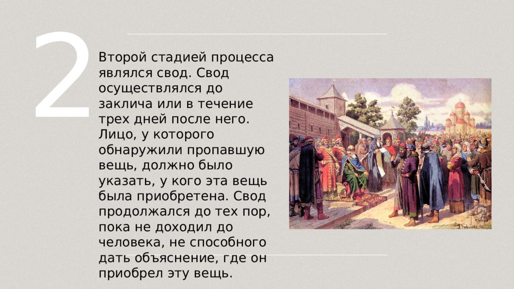 2 Второй стадией процесса являлся свод. Свод осуществлялся до заклича или в течение трех дней после него. Лицо, у которого обнаружили пропавшую вещь, должно было указать, у кого эта вещь была приобретена. Свод продолжался до тех пор, пока не доходил до человека, не способного дать объяснение, где он приобрел эту вещь.