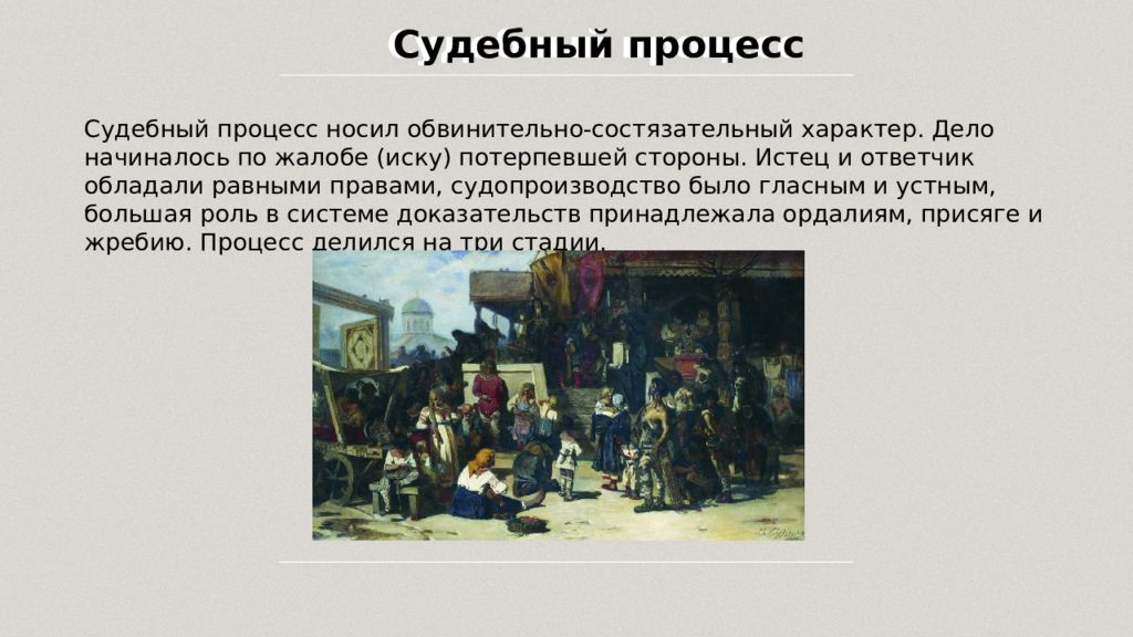 Судебный процесс носил обвинительно-состязательный характер. Дело начиналось по жалобе (иску) потерпевшей стороны. Истец и ответчик обладали равными правами, судопроизводство было гласным и устным, большая роль в системе доказательств принадлежала ордалиям, присяге и жребию. Процесс делился на три стадии. Судебный процесс Судебный процесс