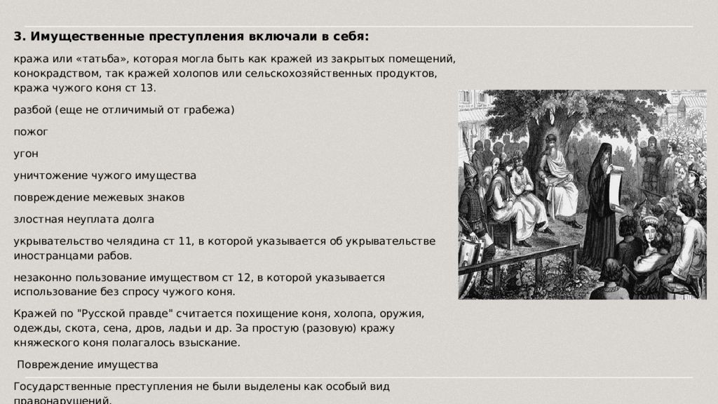 3. Имущественные преступления включали в себя: кража или «татьба», которая могла быть как кражей из закрытых помещений, конокрадством, так кражей холопов или сельскохозяйственных продуктов, кража чужого коня ст 13. разбой (еще не отличимый от грабежа) пожог угон уничтожение чужого имущества повреждение межевых знаков злостная неуплата долга укрывательство челядина ст 11, в которой указывается об укрывательстве иностранцами рабов. незаконно пользование имуществом ст 12, в которой указывается использование без спросу чужого коня. Кражей по "Русской правде" считается похищение коня, холопа, оружия, одежды, скота, сена, дров, ладьи и др. За простую (разовую) кражу княжеского коня полагалось взыскание. Повреждение имущества Государственные преступления не были выделены как особый вид правонарушений.