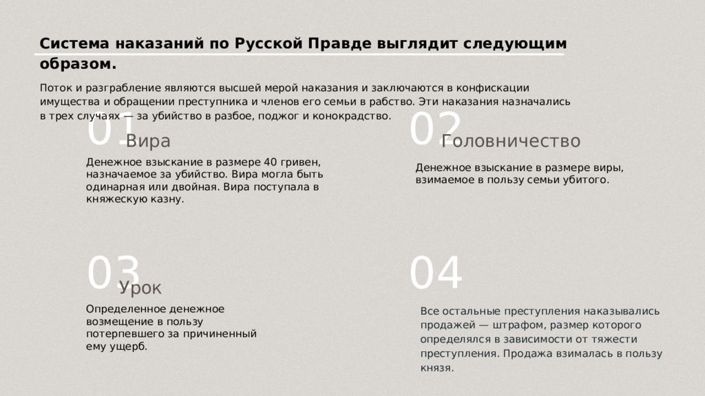 01 Вира 02 Головничество 03 Урок 04 Все остальные преступления наказывались продажей — штрафом, размер которого определялся в зависимости от тяжести преступления. Продажа взималась в пользу князя. Система наказаний по Русской Правде выглядит следующим образом. Поток и разграбление являются высшей мерой наказания и заключаются в конфискации имущества и обращении преступника и членов его семьи в рабство. Эти наказания назначались в трех случаях — за убийство в разбое, поджог и конокрадство. Денежное взыскание в размере 40 гривен, назначаемое за убийство. Вира могла быть одинарная или двойная. Вира поступала в княжескую казну. Денежное взыскание в размере виры, взимаемое в пользу семьи убитого. Определенное денежное возмещение в пользу потерпевшего за причиненный ему ущерб.