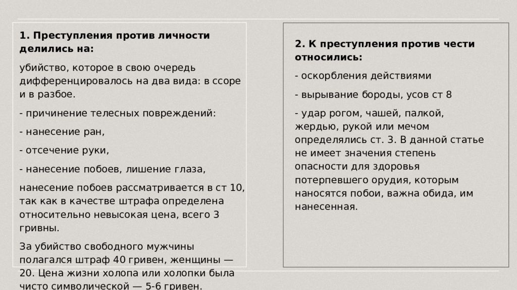1. Преступления против личности делились на: убийство, которое в свою очередь дифференцировалось на два вида: в ссоре и в разбое. - причинение телесных повреждений: - нанесение ран, - отсечение руки, - нанесение побоев, лишение глаза, нанесение побоев рассматривается в ст 10, так как в качестве штрафа определена относительно невысокая цена, всего 3 гривны. За убийство свободного мужчины полагался штраф 40 гривен, женщины — 20. Цена жизни холопа или холопки была чисто символической — 5-6 гривен. 2. К преступления против чести относились: - оскорбления действиями - вырывание бороды, усов ст 8 - удар рогом, чашей, палкой, жердью, рукой или мечом определялись ст. 3. В данной статье не имеет значения степень опасности для здоровья потерпевшего орудия, которым наносятся побои, важна обида, им нанесенная.