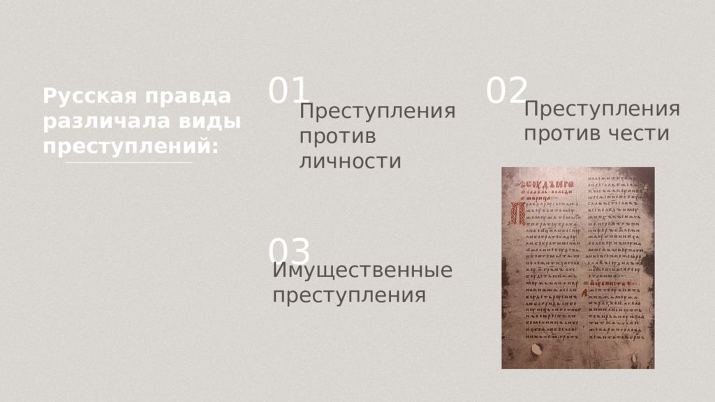 01 Преступления против личности 02 03 Имущественные преступления Преступления против чести Русская правда различала виды преступлений: