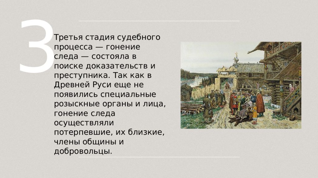 3 Третья стадия судебного процесса — гонение следа — состояла в поиске доказательств и преступника. Так как в Древней Руси еще не появились специальные розыскные органы и лица, гонение следа осуществляли потерпевшие, их близкие, члены общины и добровольцы.