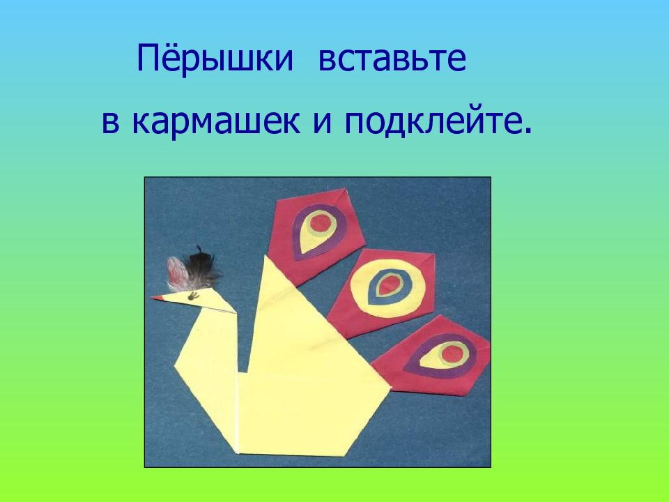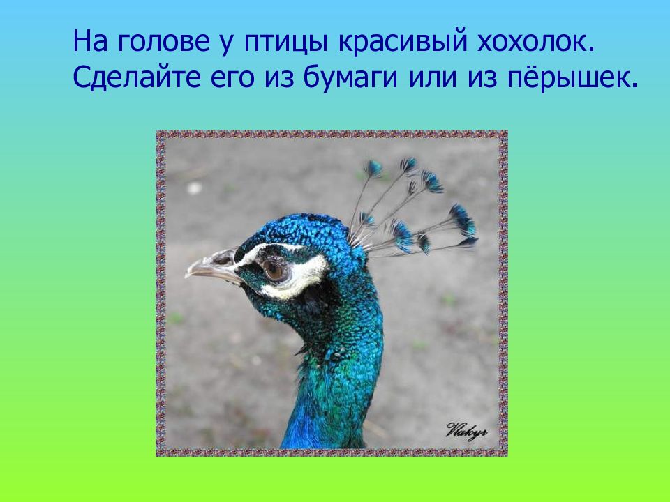 Слайд 13: На голове у птицы красивый хохолок. Сделайте его из бумаги или из пёрышек
