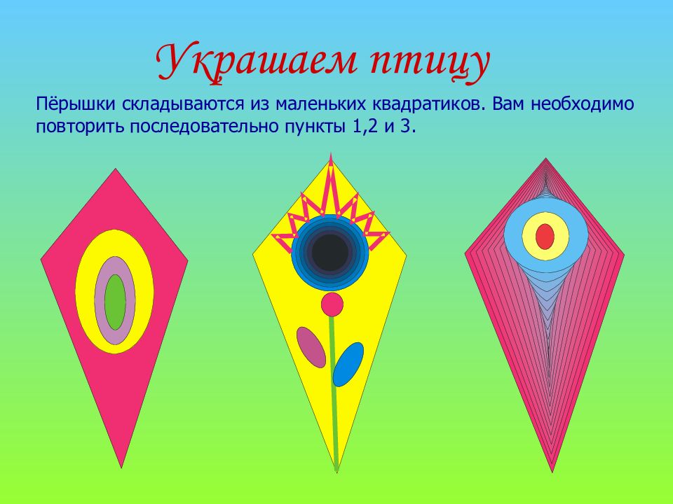 Пёрышки складываются из маленьких квадратиков. Вам необходимо повторить последовательно пункты 1,2 и 3. Украшаем птицу