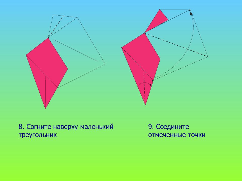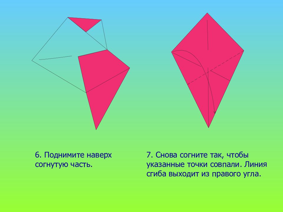 6. Поднимите наверх согнутую часть. 7. Снова согните так, чтобы указанные точки совпали. Линия сгиба выходит из правого угла.