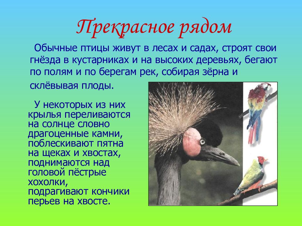 Обычные птицы живут в лесах и садах, строят свои гнёзда в кустарниках и на высоких деревьях, бегают по полям и по берегам рек, собирая зёрна и склёвывая плоды. У некоторых из них крылья переливаются на солнце словно драгоценные камни, поблескивают пятна на щеках и хвостах, поднимаются над головой пёстрые хохолки, подрагивают кончики перьев на хвосте. Прекрасное рядом