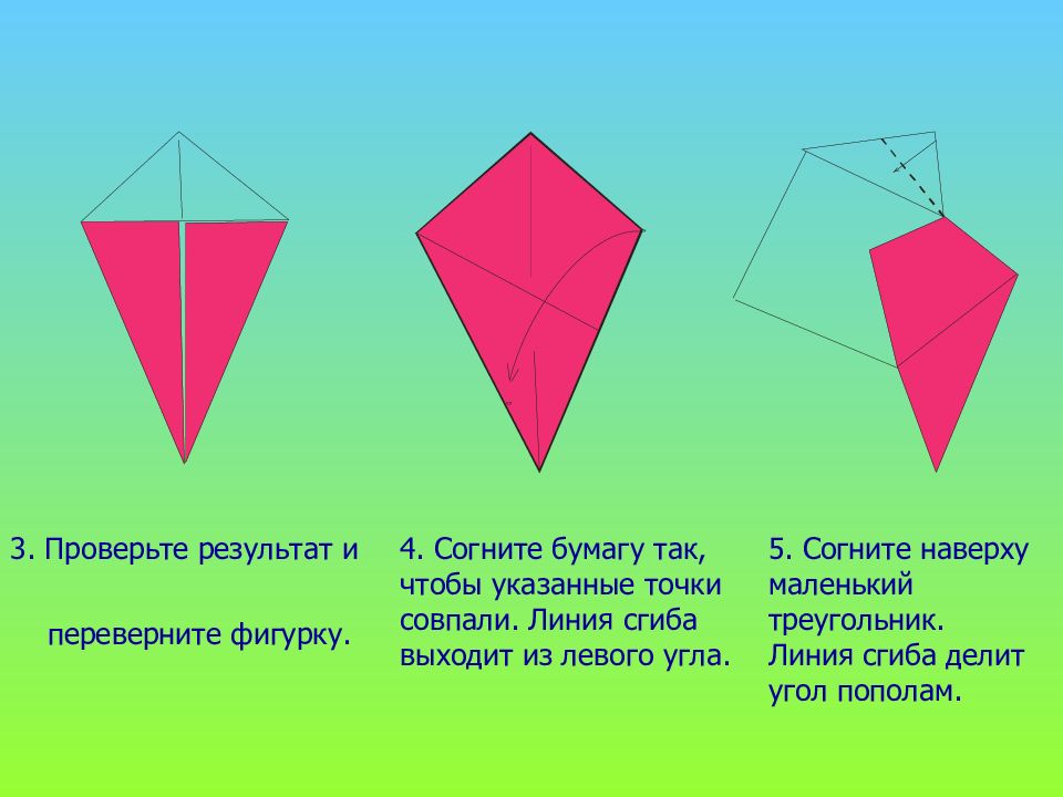 3. Проверьте результат и переверните фигурку. 4. Согните бумагу так, чтобы указанные точки совпали. Линия сгиба выходит из левого угла. 5. Согните наверху маленький треугольник. Линия сгиба делит угол пополам.