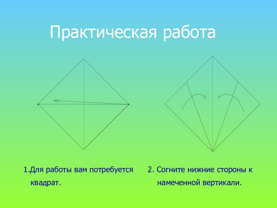 1.Для работы вам потребуется квадрат. 2. Согните нижние стороны к намеченной вертикали.