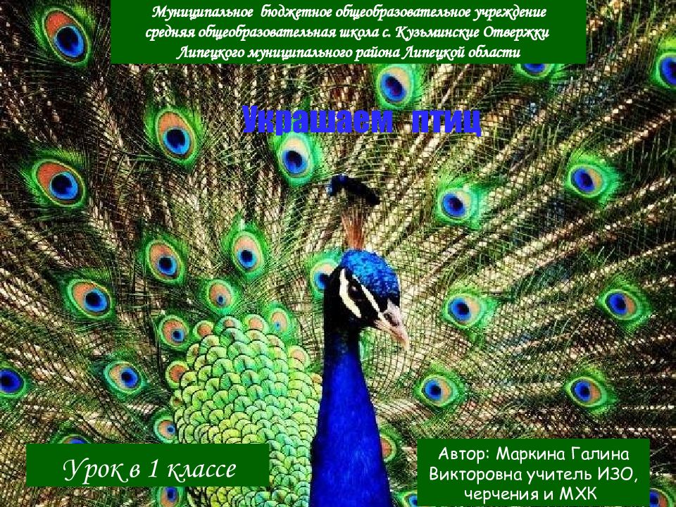 Украшаем птиц Муниципальное бюджетное общеобразовательное учреждение средняя общеобразовательная школа с. Кузьминские Отвержки Липецкого муниципального района Липецкой области Автор: Маркина Галина Викторовна учитель ИЗО, черчения и МХК Урок в 1 классе