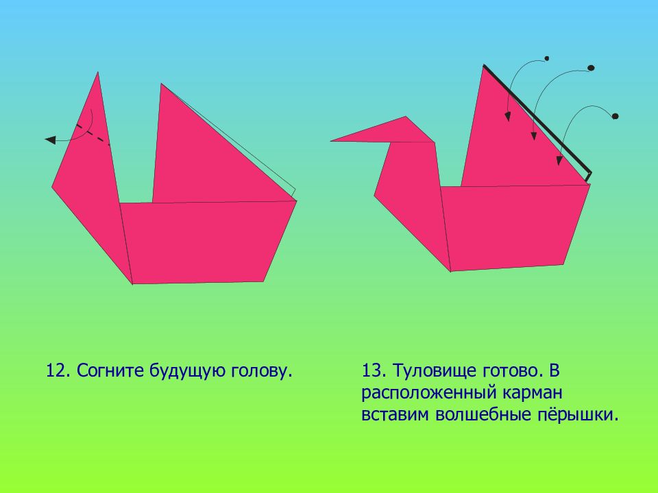 12. Согните будущую голову. 13. Туловище готово. В расположенный карман вставим волшебные пёрышки.