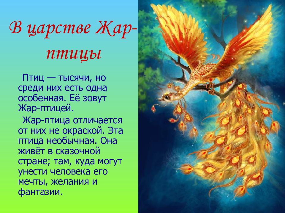 Птиц — тысячи, но среди них есть одна особенная. Её зовут Жар-птицей. Жар-птица отличается от них не окраской. Эта птица необычная. Она живёт в сказочной стране; там, куда могут унести человека его мечты, желания и фантазии. В царстве Жар-птицы