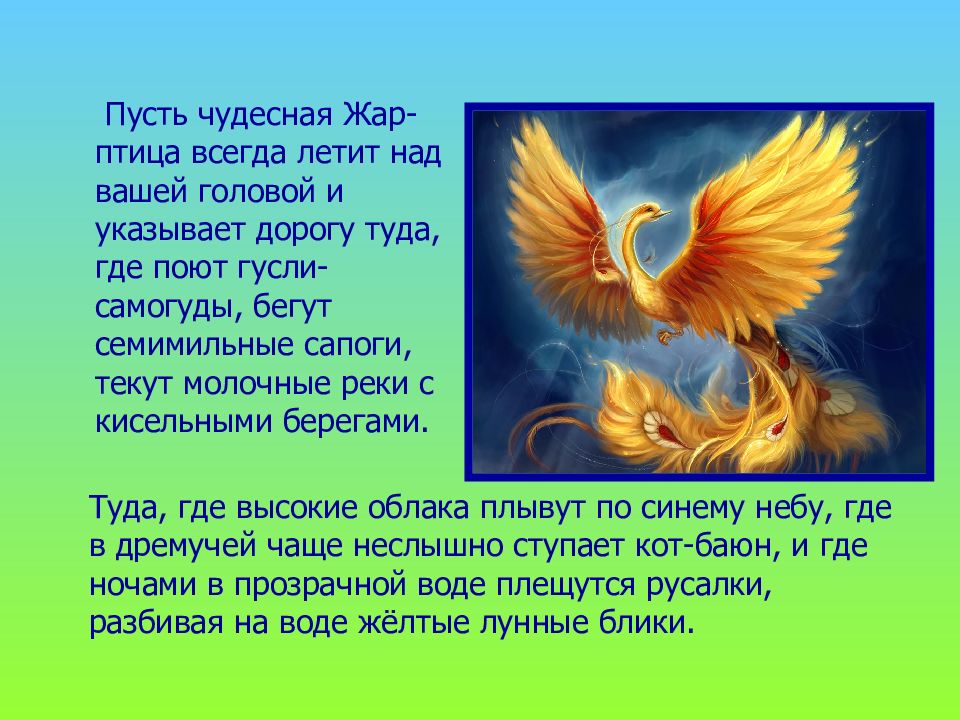 Пусть чудесная Жар-птица всегда летит над вашей головой и указывает дорогу туда, где поют гусли-самогуды, бегут семимильные сапоги, текут молочные реки с кисельными берегами. Туда, где высокие облака плывут по синему небу, где в дремучей чаще неслышно ступает кот-баюн, и где ночами в прозрачной воде плещутся русалки, разбивая на воде жёлтые лунные блики.