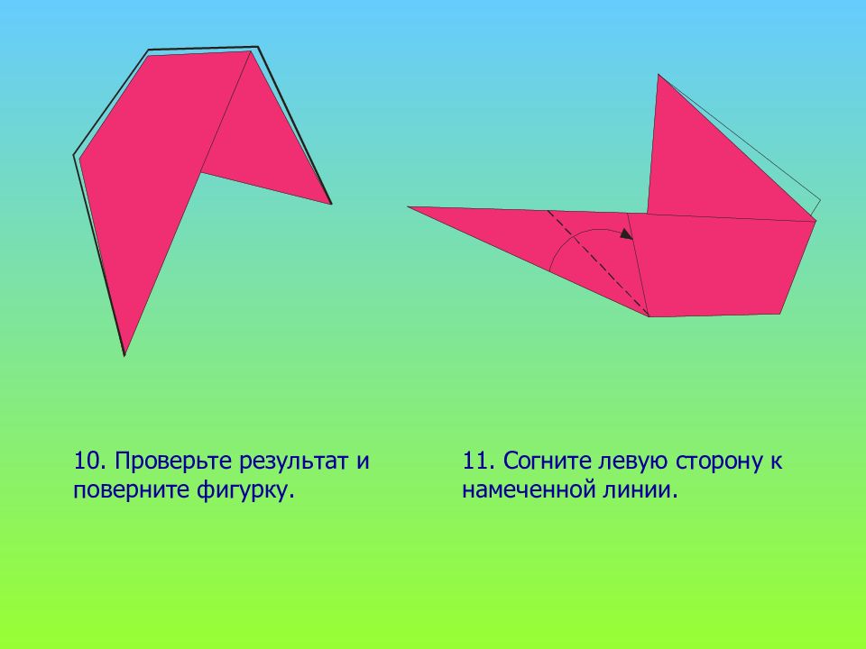 10. Проверьте результат и поверните фигурку. 11. Согните левую сторону к намеченной линии.