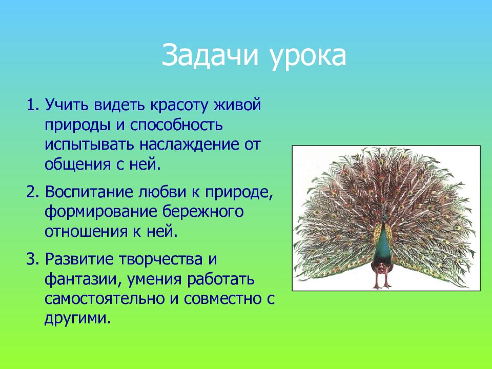 1. Учить видеть красоту живой природы и способность испытывать наслаждение от общения с ней. 2. Воспитание любви к природе, формирование бережного отношения к ней. 3. Развитие творчества и фантазии, умения работать самостоятельно и совместно с другими.