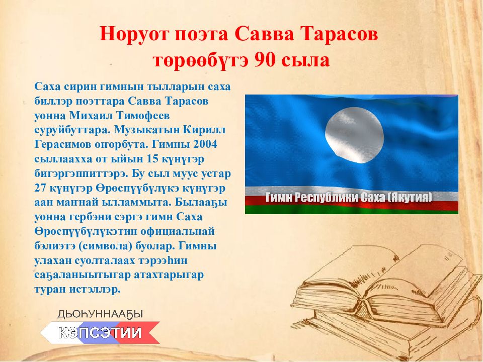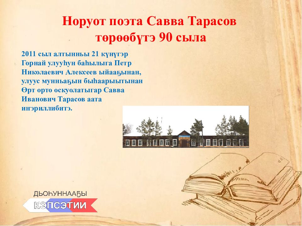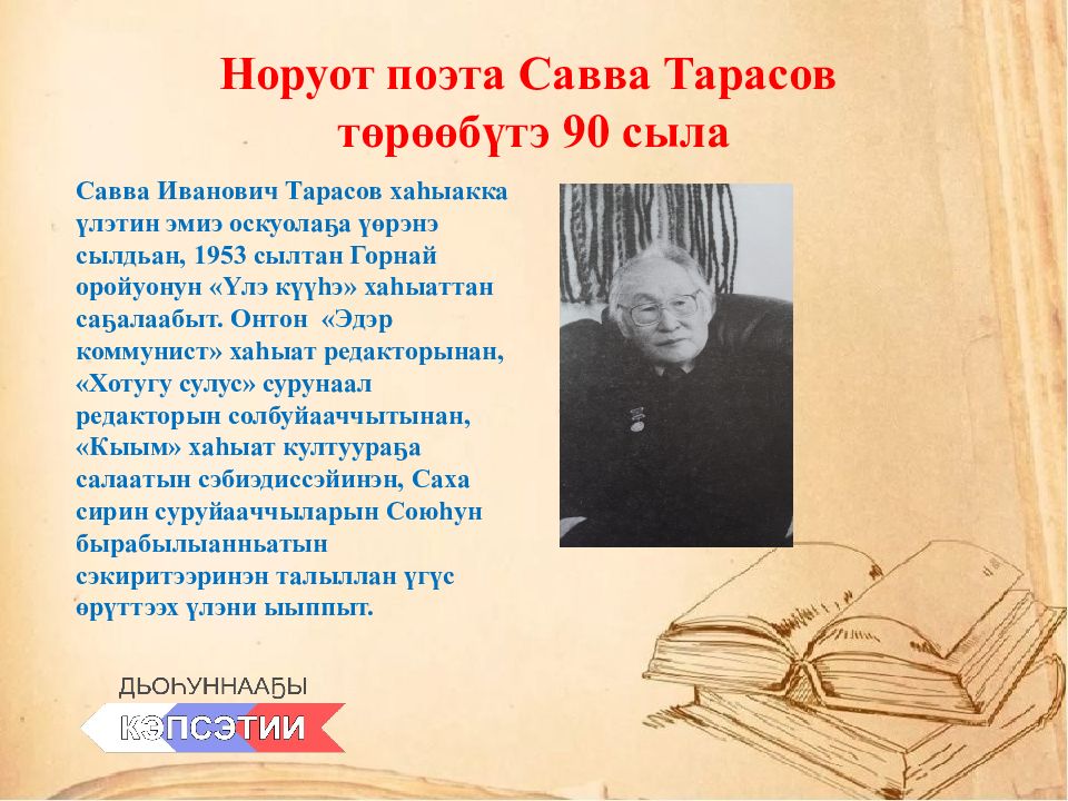 Слайд 5: Норуот поэта Савва Тарасов төрөөбүтэ 90 сыла