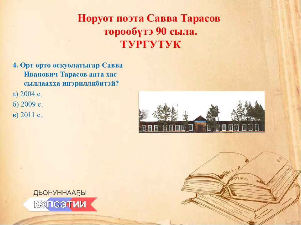 4. Өрт орто оскуолатыгар Савва Иванович Тарасов аата хас сыллаахха иҥэриллибитэй ? а) 2004 с. б) 2009 с. в) 2011 с.