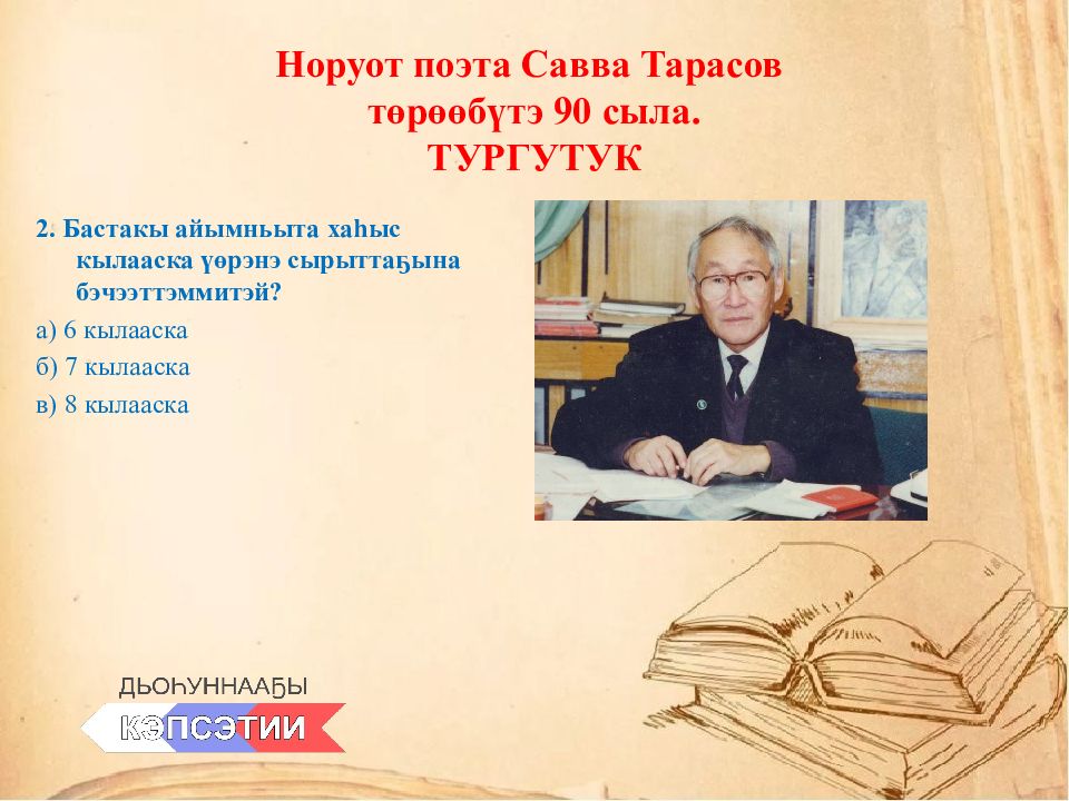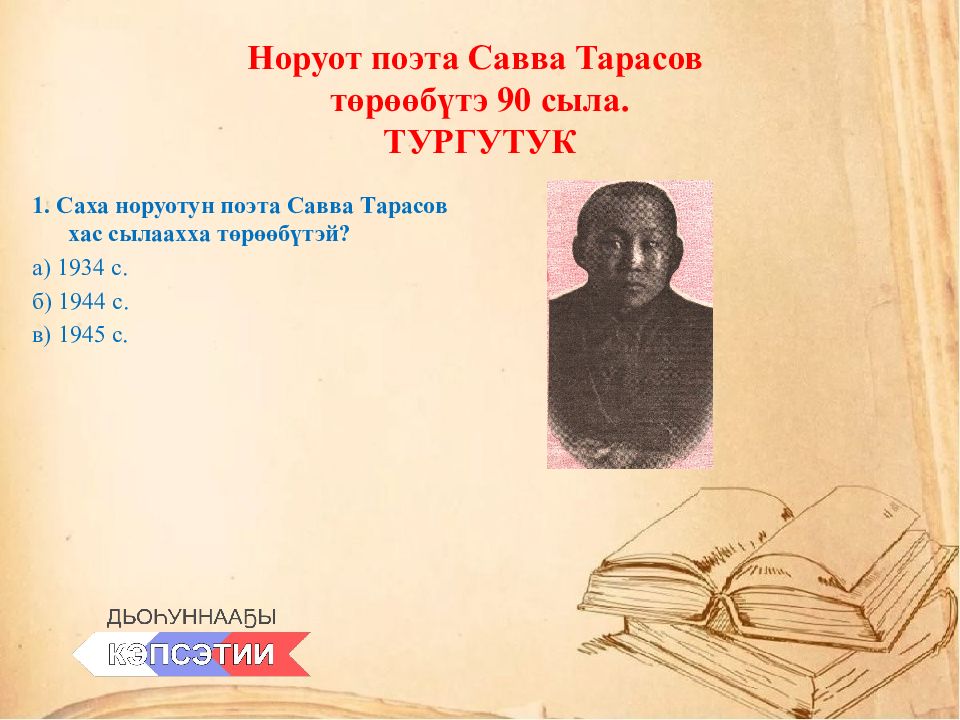 1. Саха норуотун поэта Савва Тарасов хас сылаахха төрөөбүтэй ? а) 1934 с. б) 1944 с. в) 1945 с.