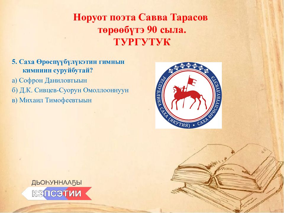 5. Саха Өрөспүүбүлүкэтин гимнын кимниин суруйбутай ? а) Софрон Даниловтыын б) Д.К. Сивцев-Суорун Омоллооннуун в) Михаил Тимофеевтыын