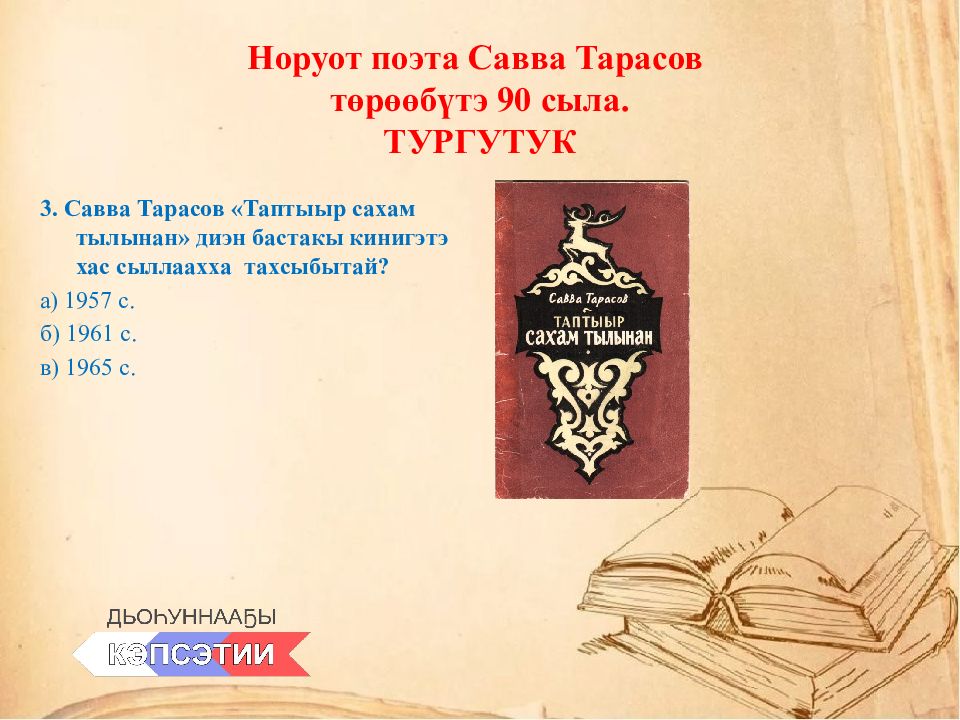 3. Савва Тарасов «Таптыыр сахам тылынан» диэн бастакы кинигэтэ хас сыллаахха тахсыбытай ? а) 1957 с. б) 1961 с. в) 1965 с.
